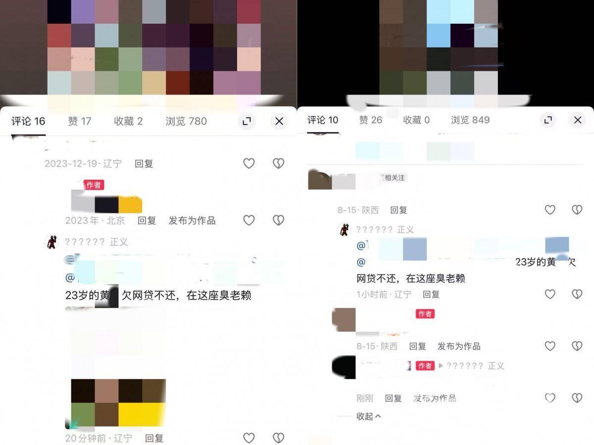 催收东谈主员在王女士一又友的抖音作品下发表指摘(开头:受访者)