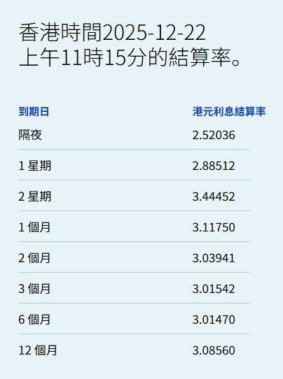 智通财经APP获悉开云体育(中国)官方网站,12月22日,港元拆息大批向下,隔夜息报2.52036%,跌2.797基点;一周拆息升6.048基点,报2.88512%,两周则升3.273基点,报3.44452%。与楼按相干的一个月拆息连跌三日报3.1175%,跌5.048基点。