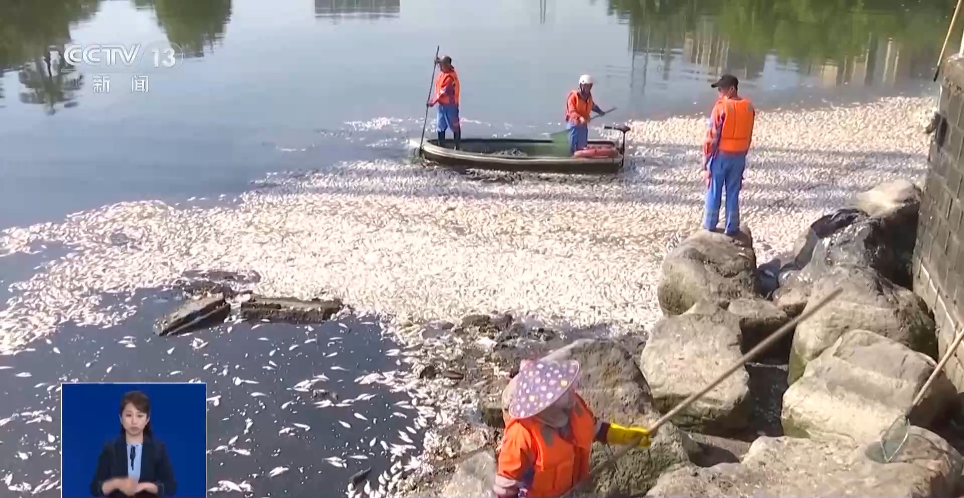 发现湖中有大宗死鱼后,当地组织环卫工东说念主进行现场计帐,将死鱼打捞上岸。