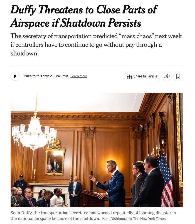 △《纽约时报》11月4日报谈,交通部长达菲称,要是政府赓续“停摆”、交通管制员赓续无薪加班,下周恐将出现大鸿沟狼籍词语,并恐吓要关闭国度空域