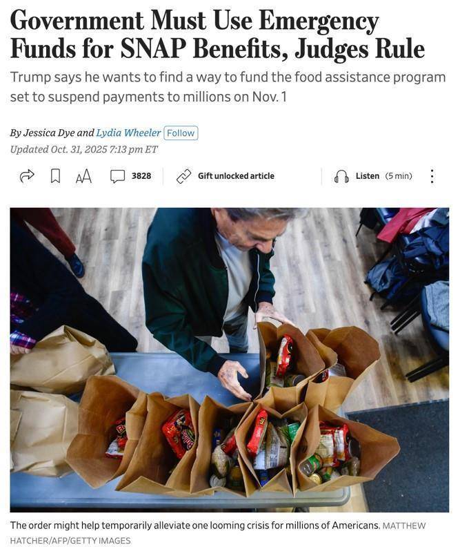 △《华尔街日报》报谈,两名联邦法官10月31日作念出判决,条款政府必须动用救急资金保证食物福利披发