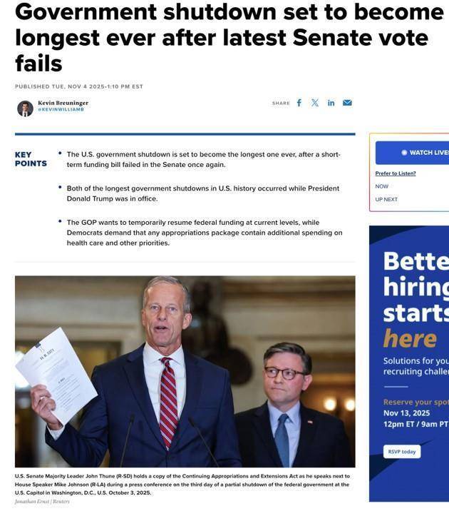 △据CNBC报谈,好意思国参院再次未能通过临时拨款法案,这次政府“停摆”将成史上最长