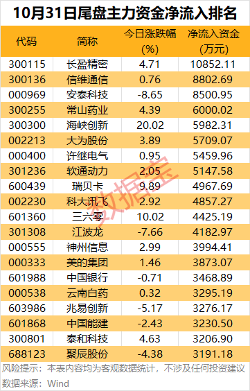 个股方面,长盈精密尾盘主力资金净流入1.09亿元;信维通讯、安泰科技、常山药业、海峡改进、大为股份等尾盘主力资金净流入均超5000万元。
