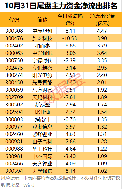 尾盘主力资金净流出方面,中际旭创、胜宏科技、和而泰、中兴通讯、宁德期间尾盘主力资金净流出均超3亿元;立讯精密、阳光电源、先导智能尾盘主力资金净流出均超2亿元。